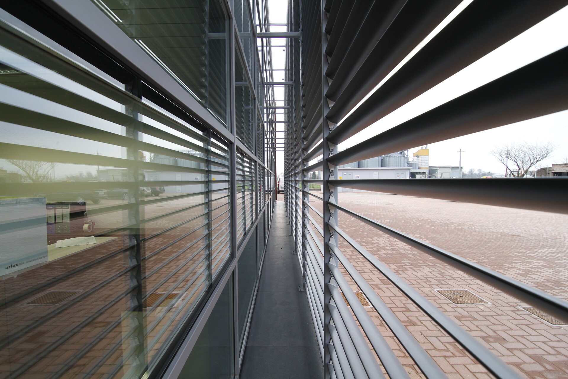 Per la ristrutturazione di una prestigiosa sede di Parma, abbiamo realizzato i serramenti esterni, le facciate continue, i rivestimenti esterni tipo Aluco-bond in lamiera verniciata, i frangisole esterni in alluminio, gli infissi interni ed i parapetti in acciaio inox