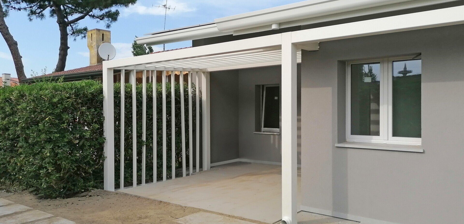 Installazione serramenti in PVC e progettazione, realizzazione e installazione di tettoia esterna in alluminio per Villetta privata.